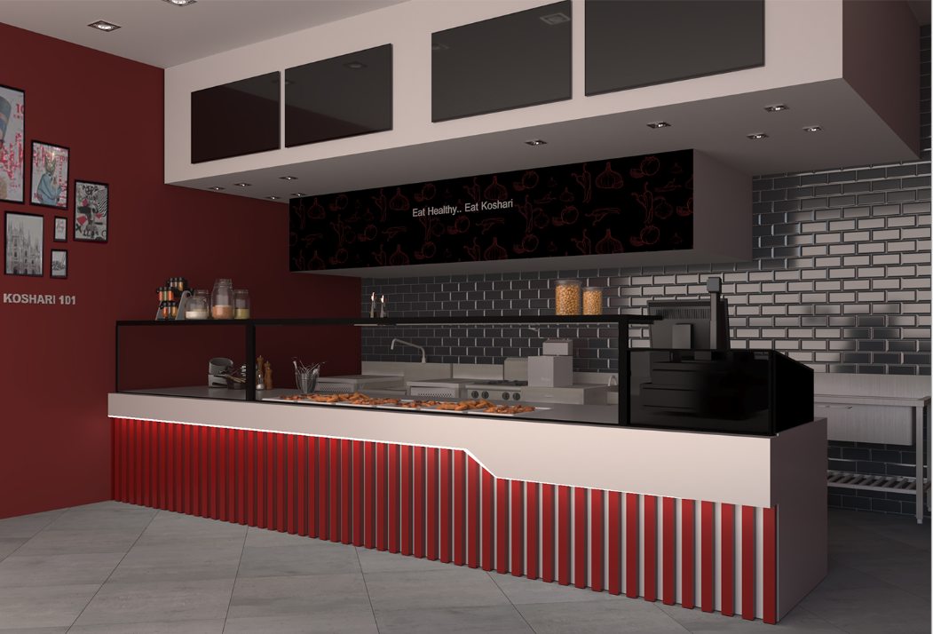 We developed the full branding and interior design concept for this modern Koshari station, creating a vibrant and efficient dining experience. Bold red tones, custom graphics, and a playful corrugated counter detail bring energy and identity to the space, establishing a memorable visual presence that reflects the brand’s authentic character.