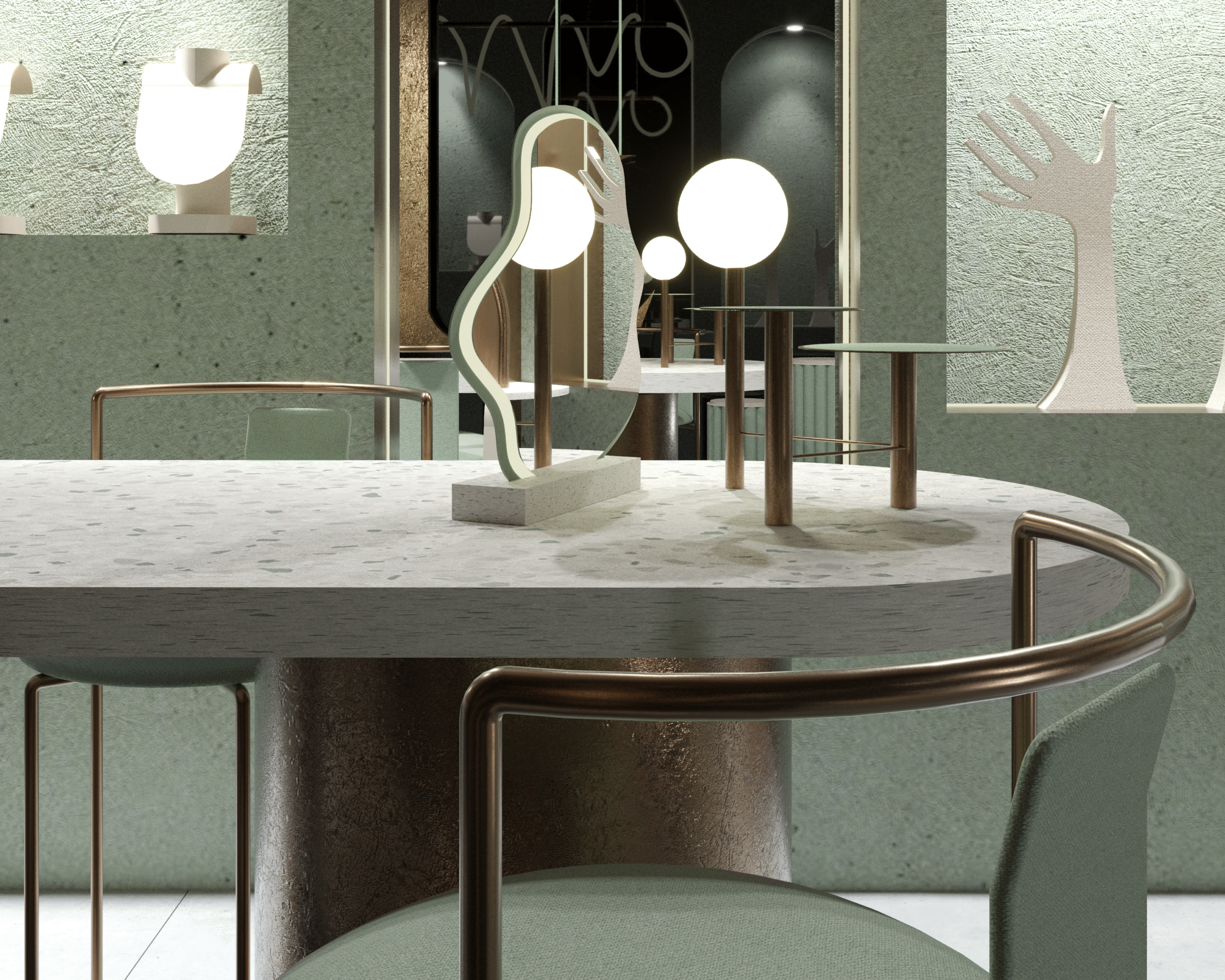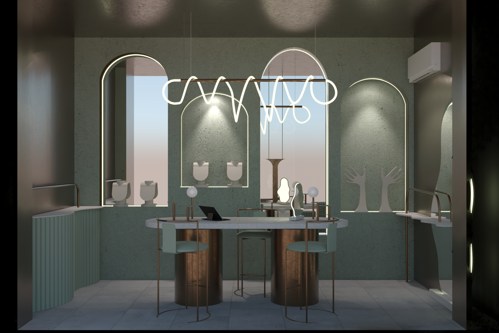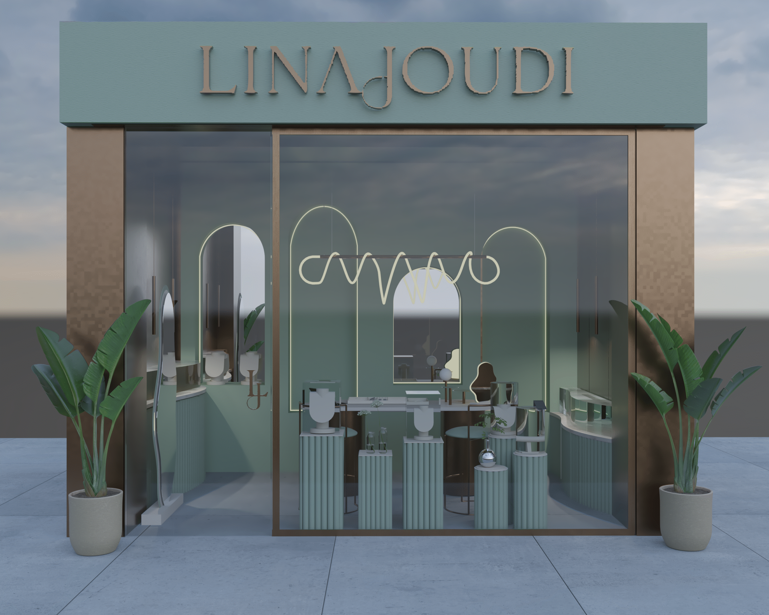 We created the full concept and interior design for Lina Joudi’s flagship boutique, translating the brand’s refined, artistic identity into a spatial experience. Soft mint tones, curved displays, and custom lighting elements set a sculptural, gallery-like atmosphere that highlights the jewelry pieces as works of art.